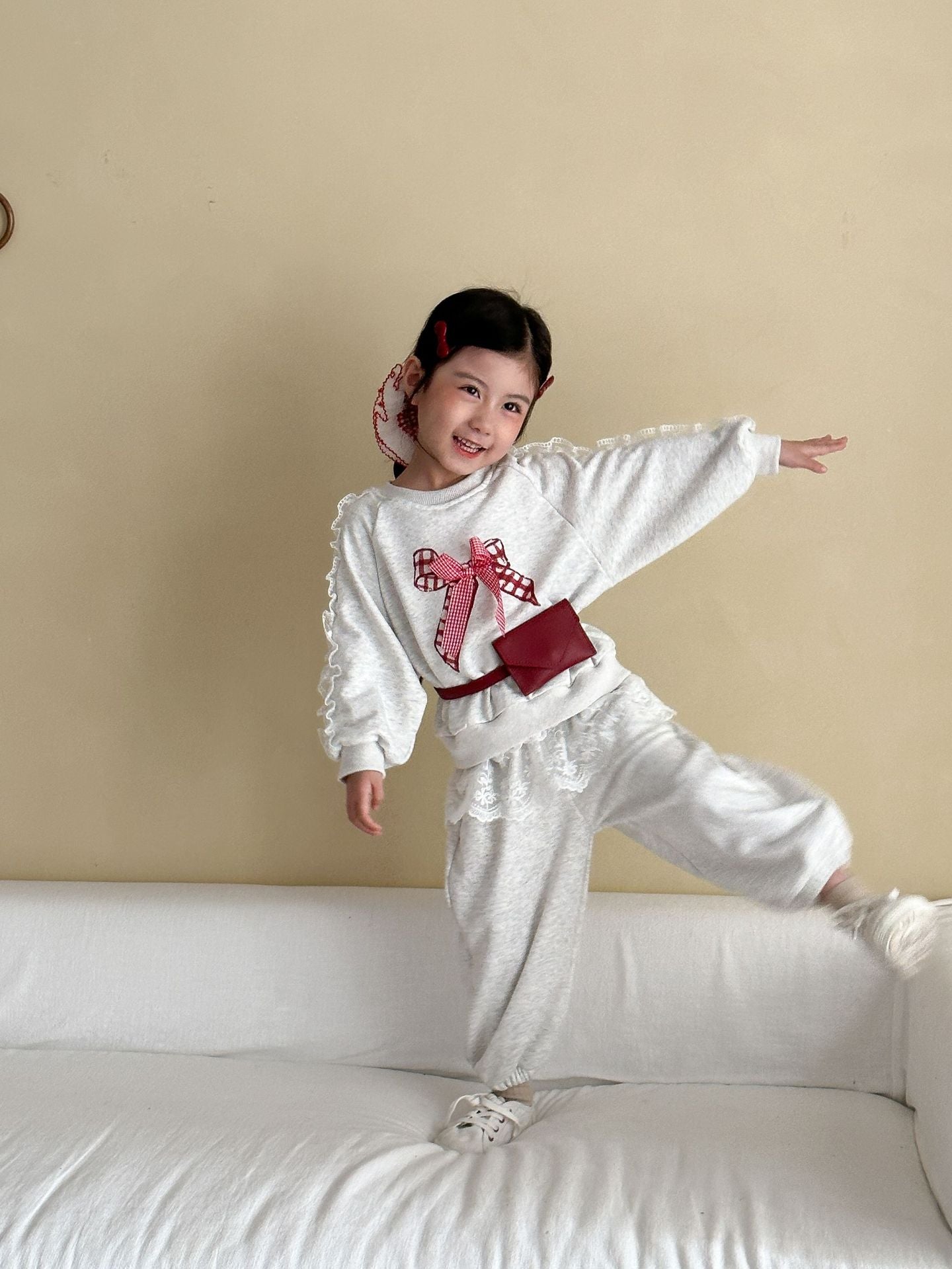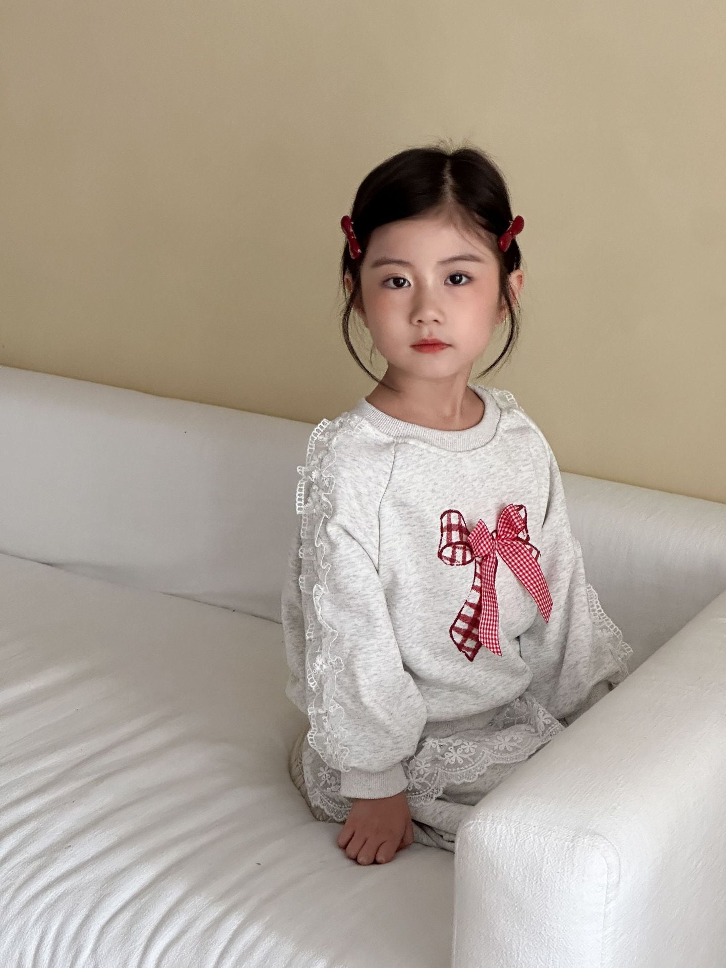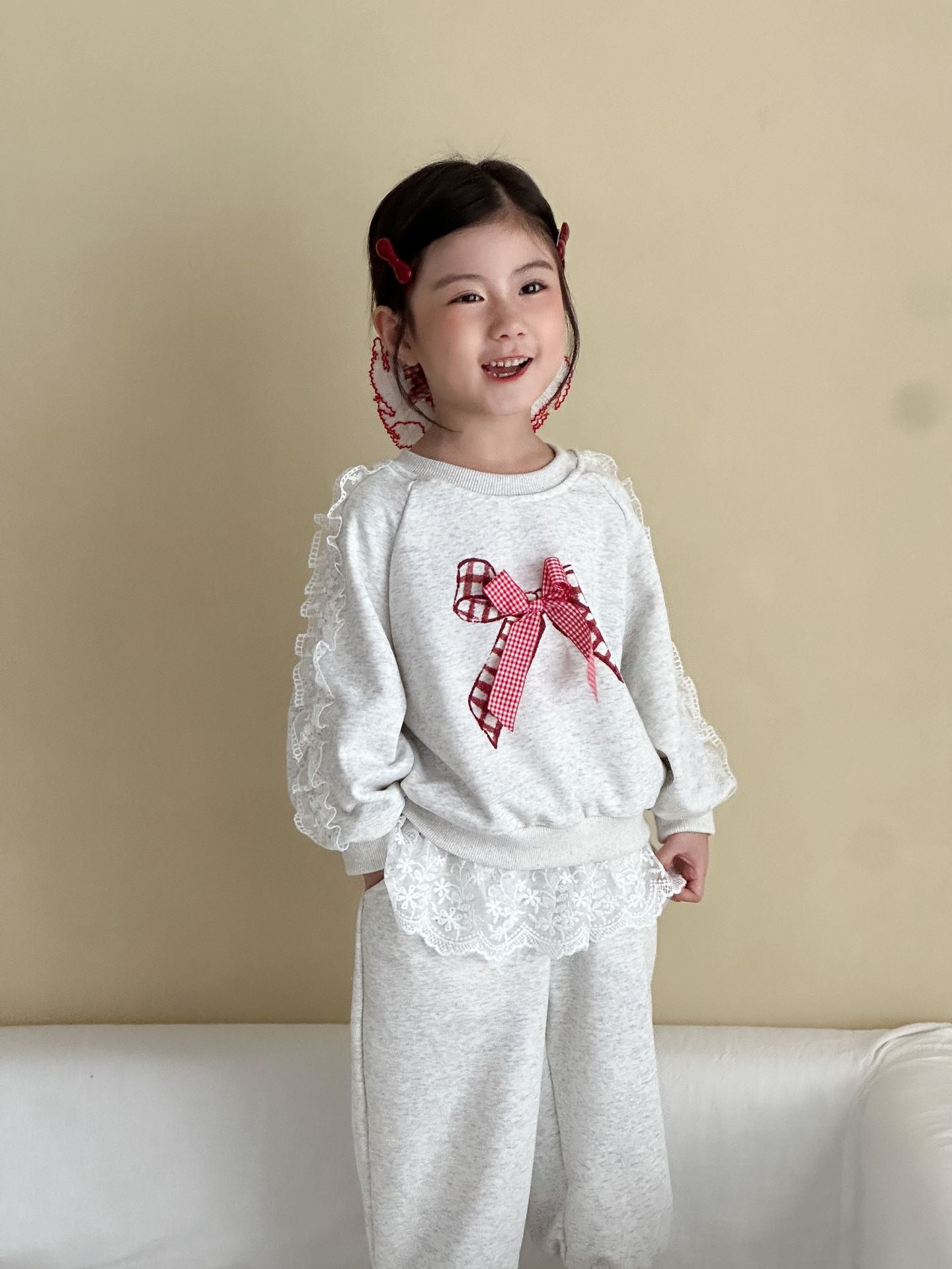 The Bow & Lace Charm Set is where everyday comfort meets a playful twist. 💕 Made of soft 100% cotton, this set features a cozy sweatshirt with lace-trimmed sleeves and a bold gingham bow, paired with joggers accented with lace ruffles. Perfect for outings, birthdays, or casual family gatherings, this outfit is as comfortable as it is eye-catching.
