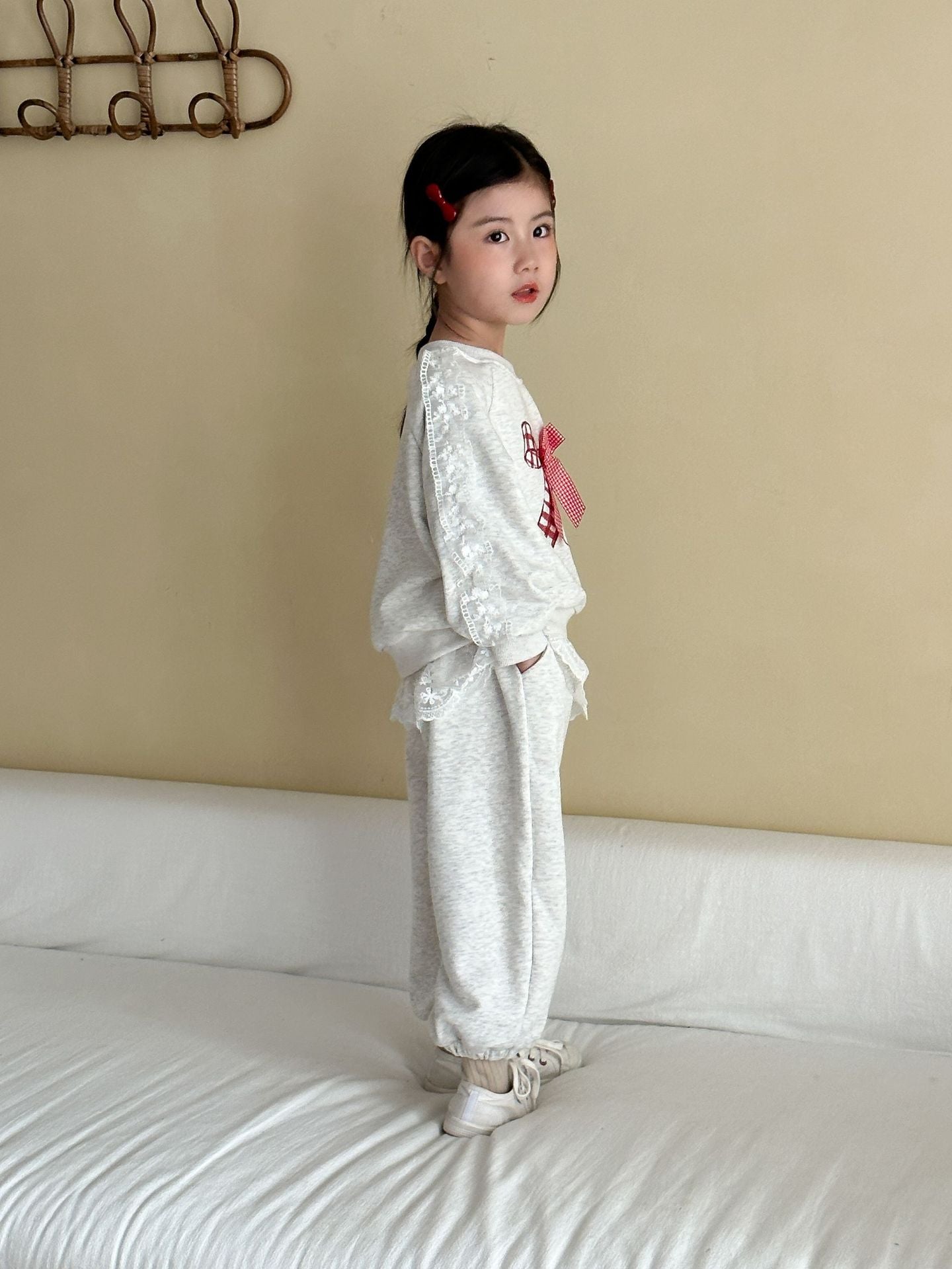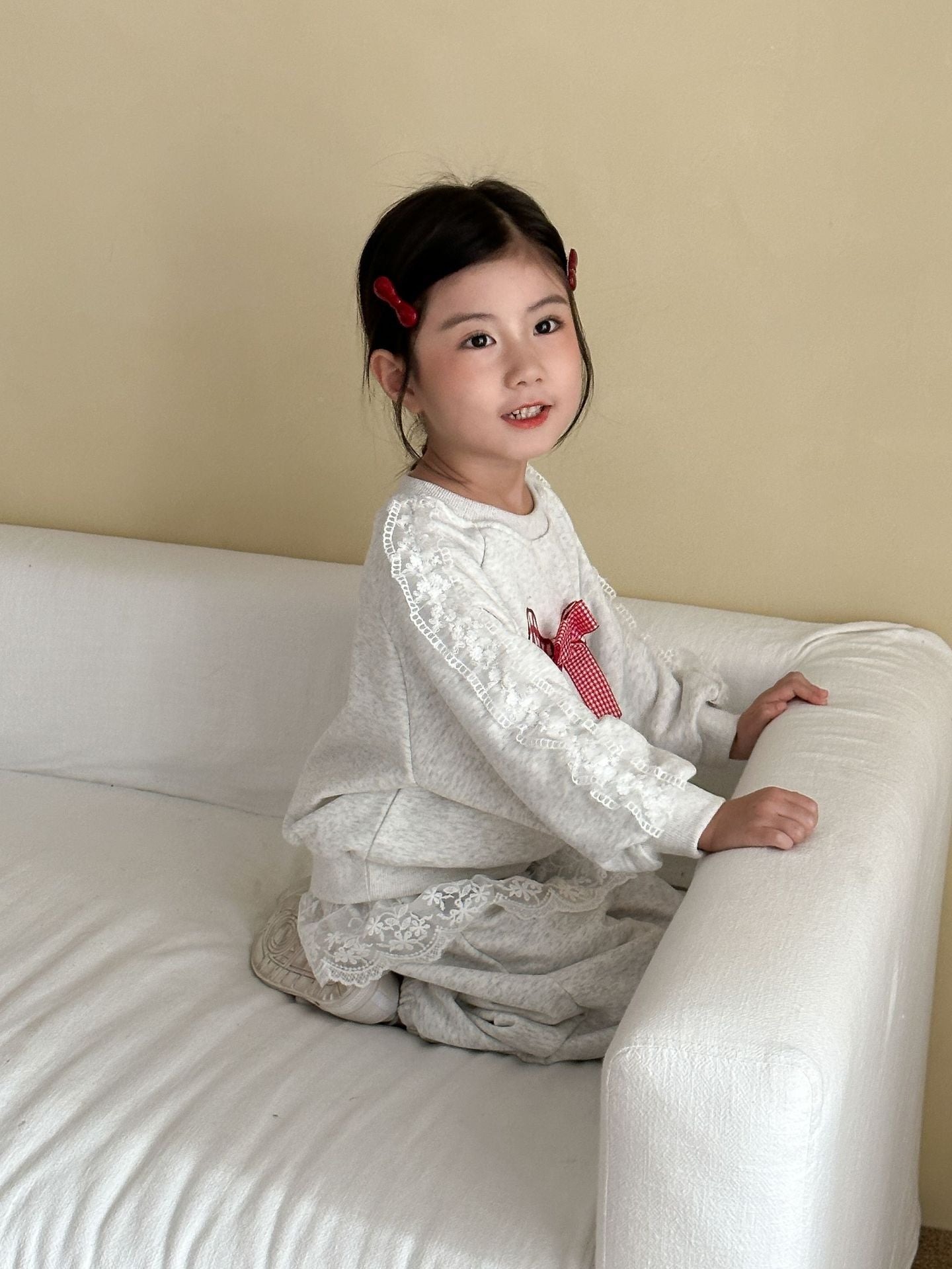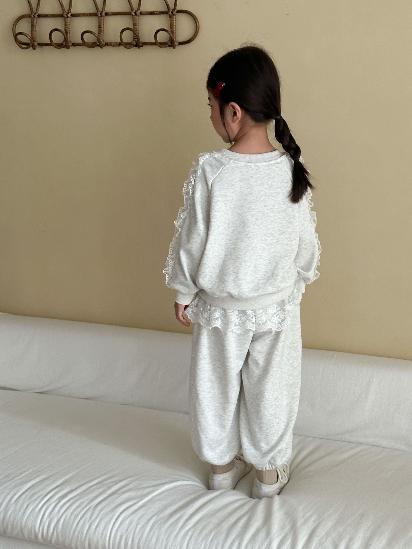 The Bow & Lace Charm Set is where everyday comfort meets a playful twist. 💕 Made of soft 100% cotton, this set features a cozy sweatshirt with lace-trimmed sleeves and a bold gingham bow, paired with joggers accented with lace ruffles. Perfect for outings, birthdays, or casual family gatherings, this outfit is as comfortable as it is eye-catching.