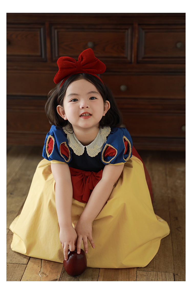 A tale of innocence and wonder, Enchanted Apple Ensemble (Set) rings fairy tales to life. Enchanted Apple Dress (Special Edition) - With the navy puff sleeves, a scalloped lace collar, and a flowing removable red tulle cape, every detail whispers of courage and charm. With the Velvet Bow Hairband - classic ruby bow headband, perfectly matching the dress for a storybook finish.Perfect for festive holidays, magical birthdays, or playful everyday adventures — where imagination reigns.