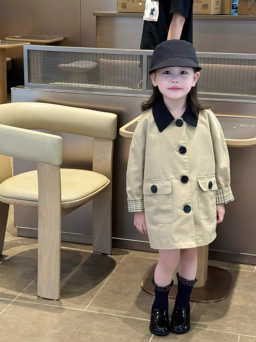 - Beige body with black contrast collar and plaid inner cuff
