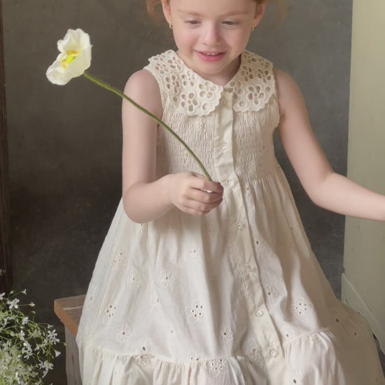 The Meadow Grace Dress is summer’s poetry — crafted in airy 100% cotton with delicate eyelet blooms, a scalloped collar, and a gently smocked bodice for comfort. Its tiered hemline dances with every step, carrying the lightness of wildflowers swaying in a meadow. Perfect for ceremonies, portraits, or days when childhood feels like a story unfolding.