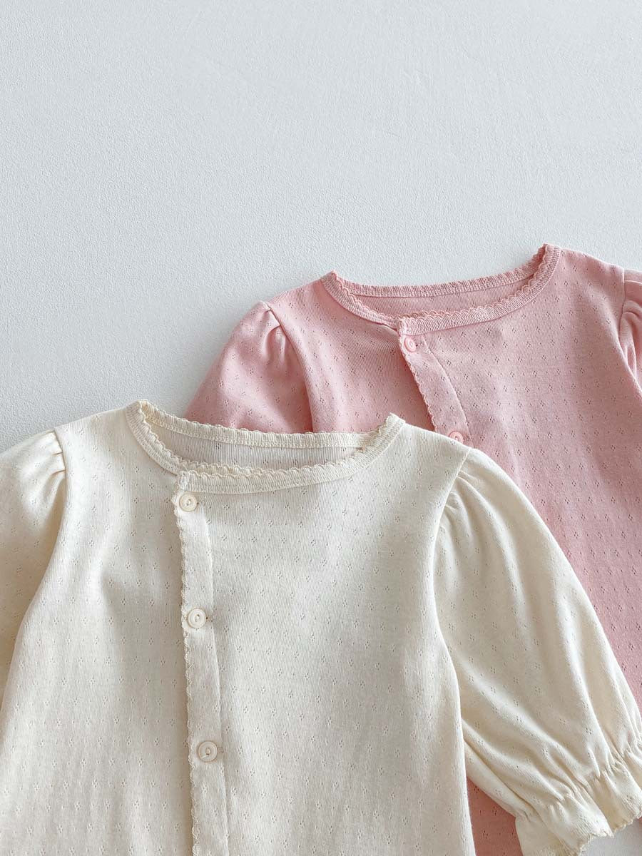 The Petite Puff Romper embodies understated sweetness — gentle cotton texture, scalloped edges, and soft puff sleeves bring a timeless feel to your baby’s first wardrobe. Designed with easy front buttons for effortless dressing and room for movement, it’s perfect for cozy days in or picture-perfect family moments. Available in ivory and blush pink for the softest Booccasion look.