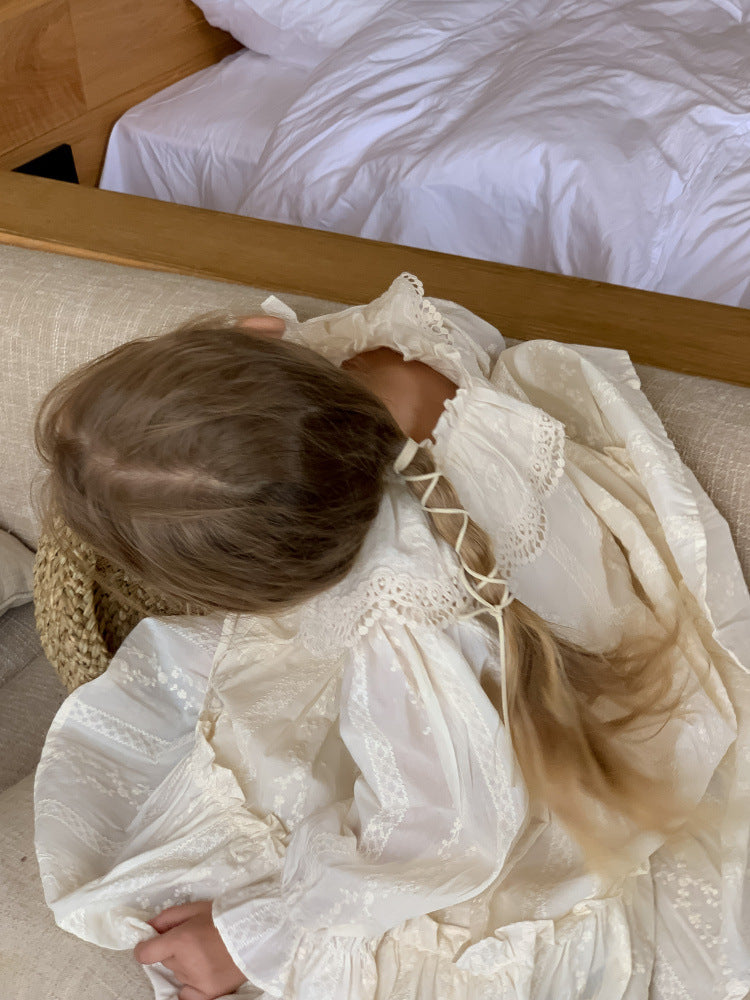 Crafted from 100% breathable cotton, the Whisper Meadow Dress captures the innocence of childhood days and the grace of celebration. Featuring a romantic ruffled collar, floral embroidery, and gentle flounce detailing, it’s designed for little girls who twirl through family gatherings, holiday dinners, or special photos.